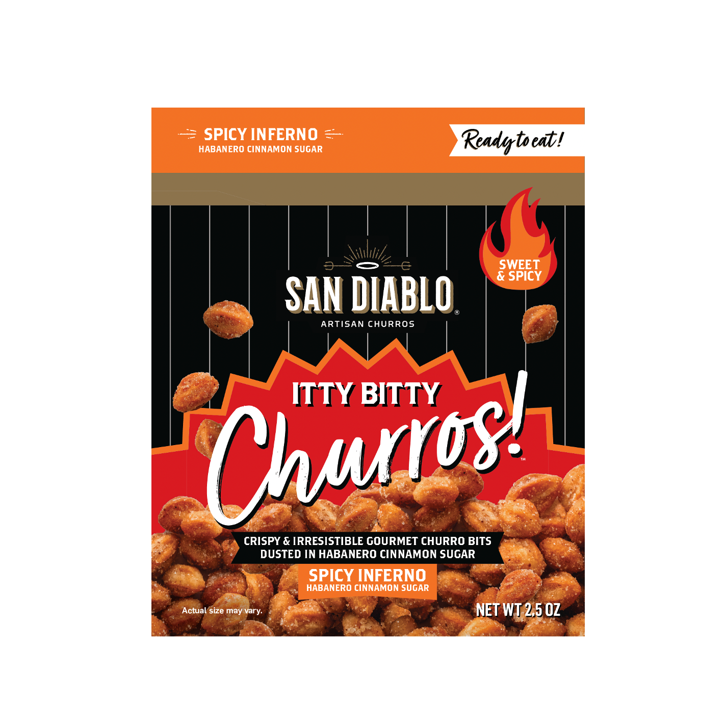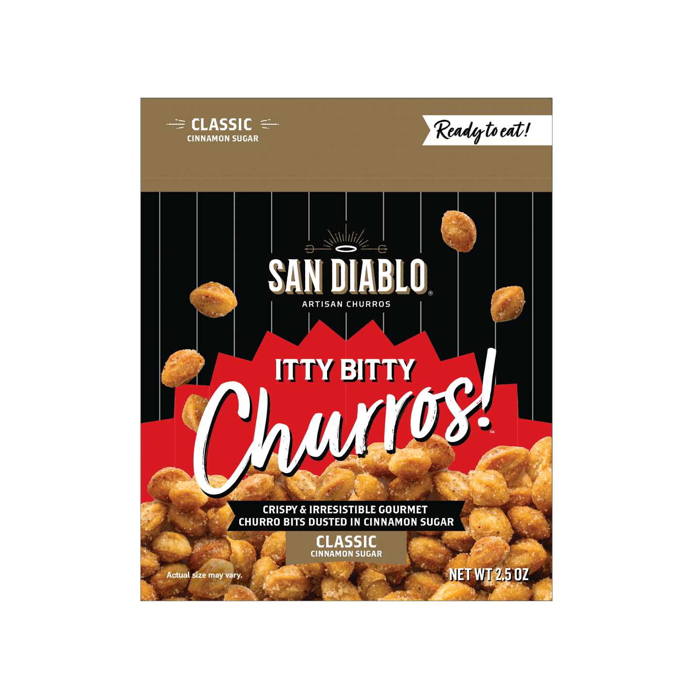 The first-ever, ready-to-eat snackable churro bits — Itty Bitty Churros are crispy, gourmet churro bits dusted in cinnamon sugar so you can enjoy churros anytime, anywhere! Choose your 2.5 oz bags of Classic, Spicy Inferno or a mix of both for your snack bag packs: