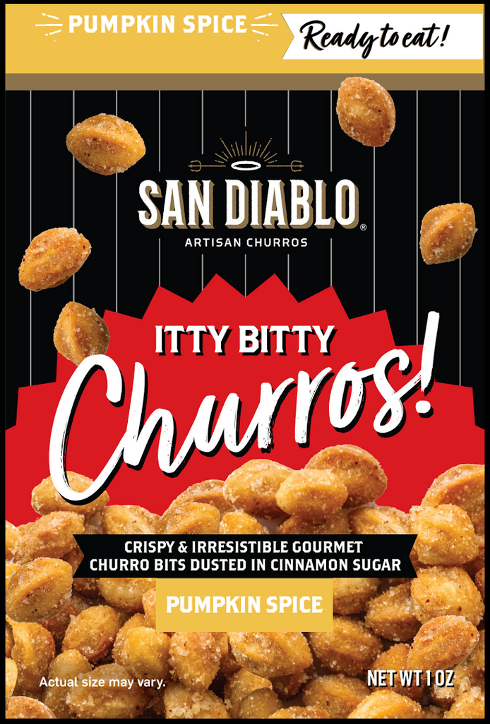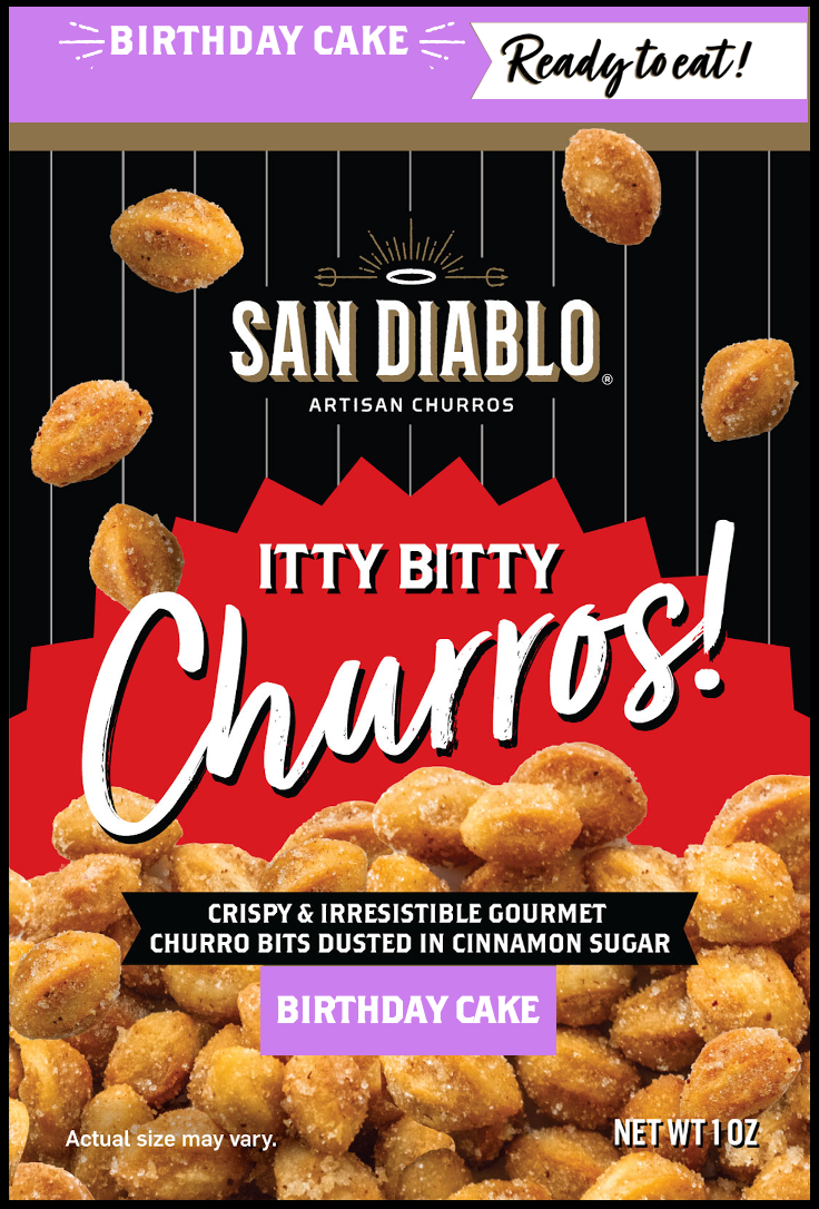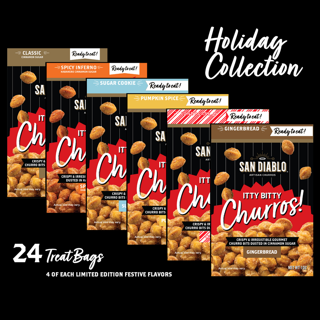 Enjoy 24 — 1 oz treat packs of our latest churro innovation — Itty Bitty Churros — in 6 different flavors in either our Holiday Collection or our Fiesta Collection!