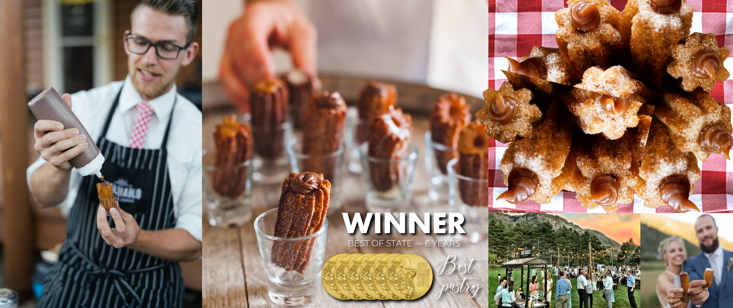 Wow your event guests with fresh made churros handcrafted to golden crispy perfection, coated with sugar and freshly ground cinnamon and then filled with a choice of sweet decadence like the traditional dulce de leche, Nutella and sweet cream or specialty flavors like coconut cream or handmade lemon curd.