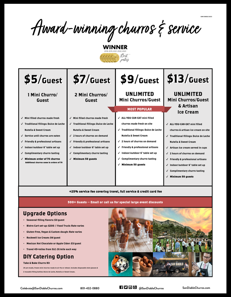 See all our great options for any price range: Frozen Pick up, Full service Catering and Unlimited mini churros!